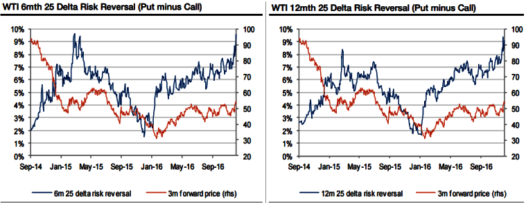 As we have mentioned before, we believe that the return of OPEC to active supply management is like to result in 3m implied crude vols trading below 30% to around 25% over time. Notably, you could also observe risk reversal curve is clearly followed by crude forwards curve.