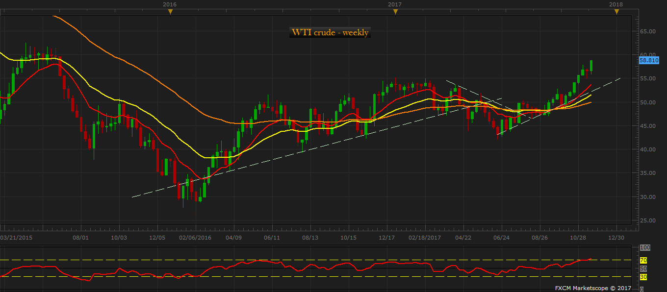 The price of WTI has risen steadily since June when it bottomed around $42 per barrel. It is up close to 40 percent since then and the price has increased in the past six out of seven weeks as the market remains focused on the upcoming OPEC/N-OPEC meeting on November 30th, where members are expected to green signal another extension to the production cuts agreement.