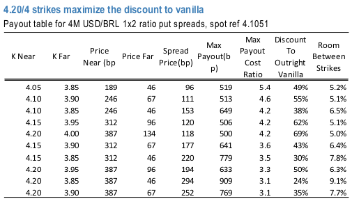 Risks of delays exist, particularly since this is a very tight schedule, but market participants may anyway position ahead of these dates, and the foreign O&G companies involved are likely to convert their FX into BRL ahead of this time frame. We also recommend a 1x2 USDp/BRLc structure (4m, K = 4/4.20) costing 118bp. Courtesy: JPM