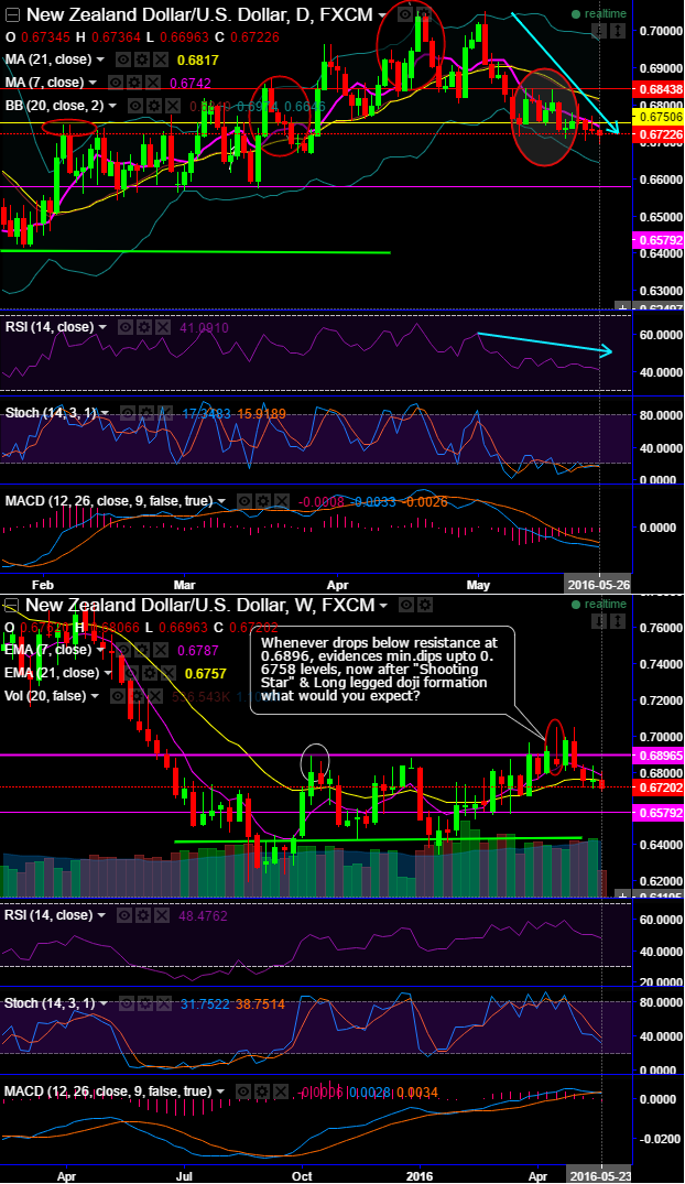 On the contrary, ever since the pair has bounced back from the lows of 0.6347 levels, Kiwi dollar seemed like consolidating stronger from last couple of weeks but for now “Shooting Star” pattern occurred at 0.6851 levels (see weekly charts).