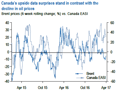 Thus is the March decline in oil prices are sustained, that could turn the tide on positive economic momentum in Canada. Already, the Canadian EASI looks too high relative to Brent prices (refer above chart).