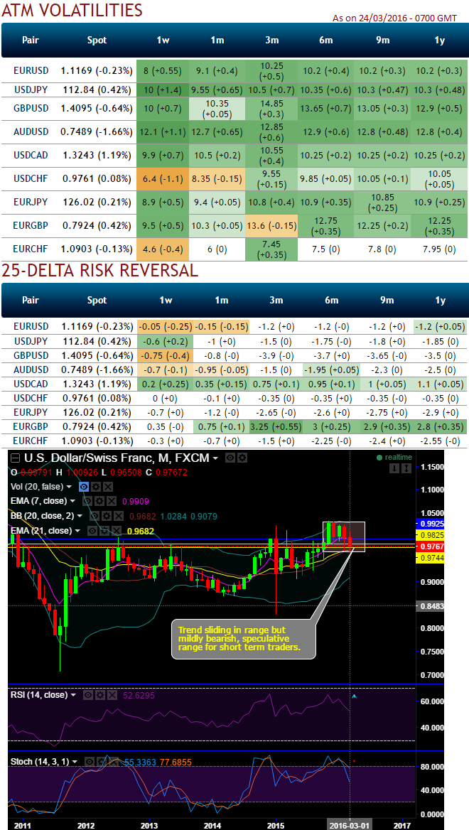 Contemplating on technicals, IVs and risk reversals we USDCHF to continue to go in narrow range, as result we could foresee the range bounded trading opportunity in prevailing range of 1.0096 and 0.9635.