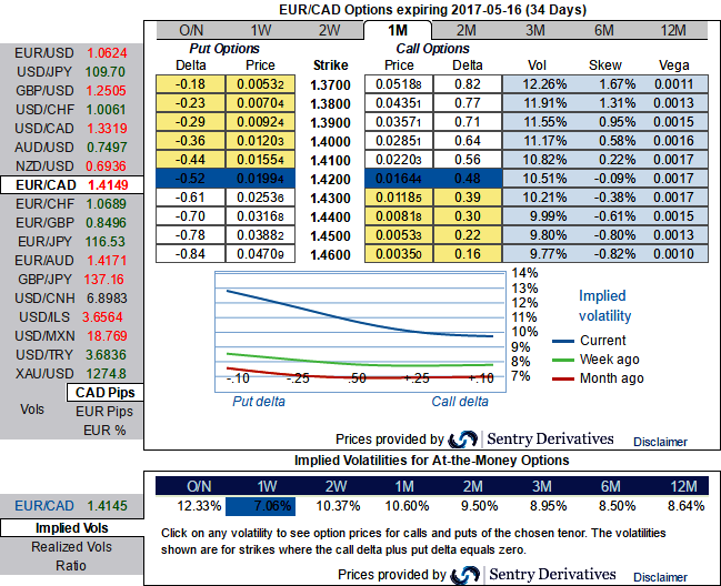 At spot ref: 1.4123 (while articulating) we advocate below FX derivatives strategy as we favor optionality to the directional trades. For the bearish streaks that we are inclined to position a partial retracement of the down move throughput ratio back spreads (PRBS), as calling the bottom is difficult and adding directional spot exposure is risky at the moment.