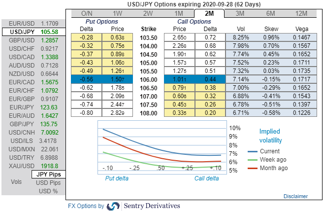 At spot reference: 105.608 levels, we advocate buying a 2M/2w 106.500/102 put spread (vols 8.25 vs 7.14 choice), we would like to maintain the ITM long leg with the diagonal tenors on hedging grounds.