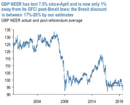 The key driving force of the recent GBP weakness has been an increasingly hardline stance by the new PM on Brexit negotiations as evident in ramping up of preparations for a possible “no-deal” outcome, Gove indicating that “no deal is now a very real prospect”, Boris Johnson’s office hinting that the next round of Brexit talks might not happen at all and apparent insensitivity of the government to recent GBP weakening. The simultaneous increase in the share of polls in favor of the Tories has not helped matters, even if it was expected following May’s departure and has come at the expense of the Brexit party (refer 2nd chart).