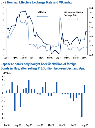 USDJPY declined on the back of US political uncertainties due to President Trump’s scandals and declining UST yields. The plunge in mid-May was mainly attributable to JPY appreciation amid deleveraging due to the US political uncertainty. While USD weakness also contributed to lower USDJPY, the Yen appreciated more than 2% in trade-weighted terms in the past month (refer above chart). USDJPY extended its downside to 109.12 on June 7, the lowest since April 21.