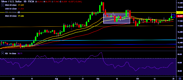 We prefer to take long position on XAG/USD around $17.95, stop loss at $17.72 and target of $18.17/$18.45.