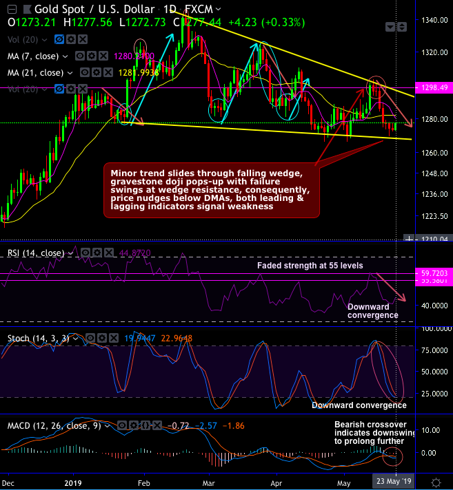 Gravestone doji has occurred at stiff wedge resistance and at $1,296.20 levels, consequently, bears have been attempting to nudge prices below 7 & 21-DMAs with bearish crossovers (on the daily chart).