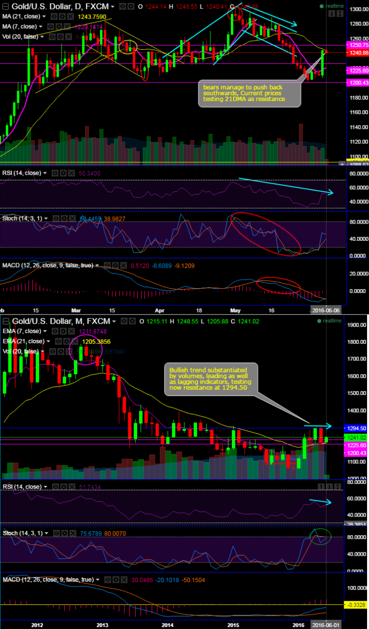 Although the precious yellow metal has spiked during early Asian sessions today could not hold onto the resistance at 1250 levels and slide below 21DMA again.