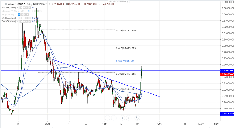 Stellar Lumens has shown a good recovery of more than 30% in past 4 hours following foot steps of Ripple. The pair hits high of $0.2570 and is currently trading around $0.252690.