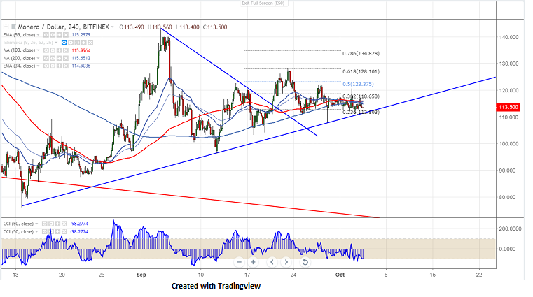 XMRUSD is trading between $107.80 and $120 for past four trading days. It is currently trading around $113.56. The pair has taken support near trend line and shown a minor jump.