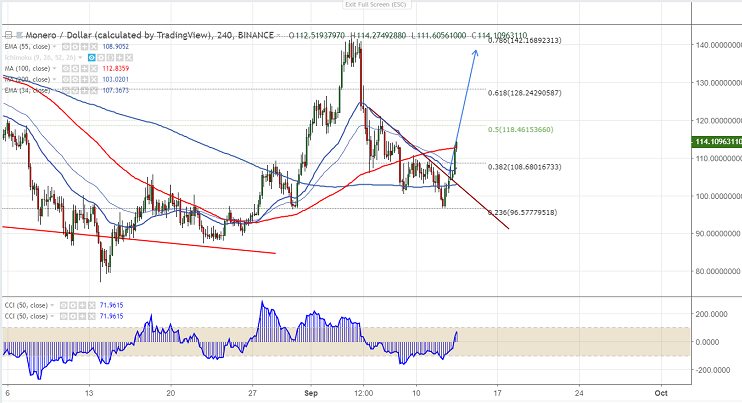 XMRUSD has shown a good recovery of more than 15% from the $96.67. The pair hits high of $113.57.