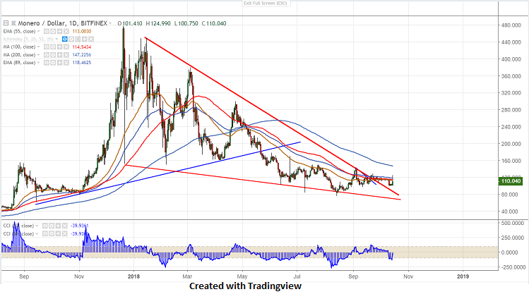Monero hits intraday high of $124.99 and shown minor decline from that level. It is currently trading around $110.20.