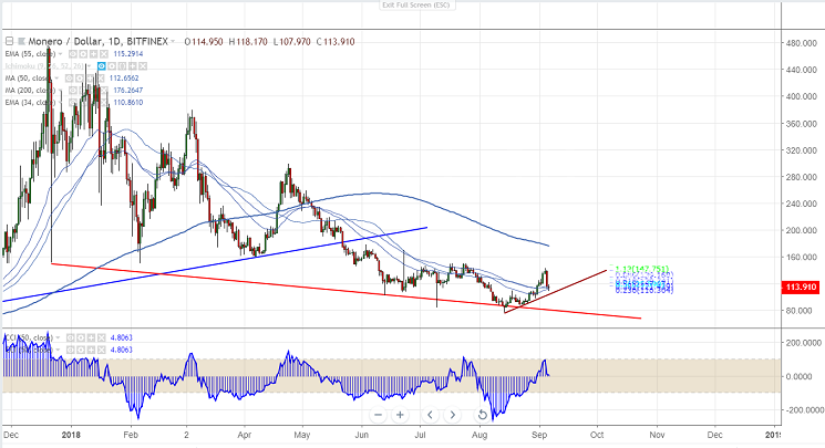 XMRUSD has lost more than 20% from the high of $141.68. The pair declined till $107.97 and is currently trading around $115.98. It has taken support at 20- day MA and shown a minor recovery.