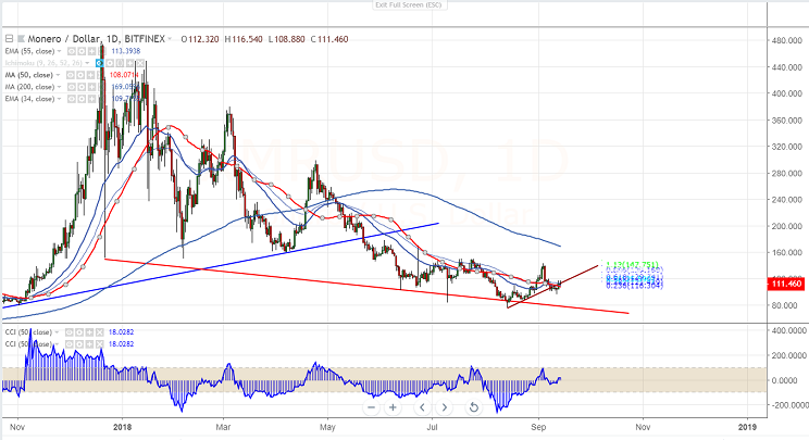 XMRUSD has shown a good recovery of more than 20% from the $96.67. The pair hits high of $116.88.