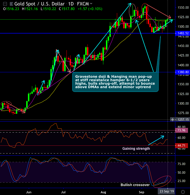 We have recently raised a cause of concern on Gold’s (XAUUSD) rallies in the short run upon bearish patterns, such as, gravestone doji and hanging man that have occurred at $1,527.05 and $1,552.14 levels. As a result, these bearish patterns have hampered the prospects of 6-1/2 years highs, while the major uptrend extends 6-year highs.