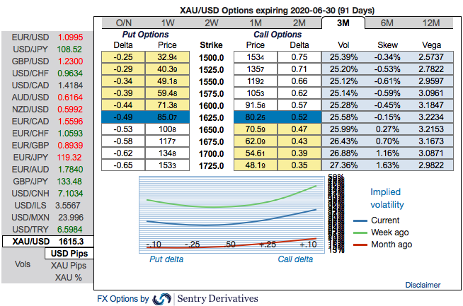 The 3m positive skewness of gold options contracts implies more demand for calls (refer 1st chart). These skewed IVs of 3m XAUUSD contracts are still indicating the upside risks, bids for OTM call strikes up to $1,725 is quite evident that reminds us hedgers’ inclination for the upside risks.
