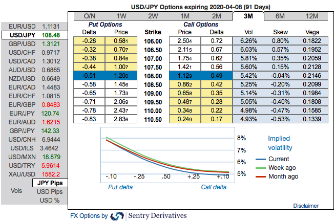 At spot reference of USDJPY: 108.704 levels, we advocate buying a 2M/2w 109.723/107 put spread (vols 5.10 vs 3.76 choice), we would like to maintain the ITM long leg with the diagonal tenors on hedging grounds.
