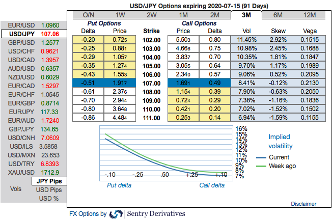At spot reference: 107.120 levels, we advocate buying a 2M/2w 108.910/102 put spread (vols 8.95 vs 8.55 choice), we would like to maintain the ITM long leg with the diagonal tenors on hedging grounds.