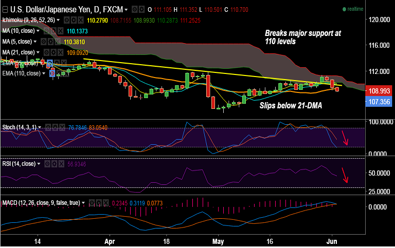 - On the daily charts, USD/JPY has broken major support at 110 levels and has slipped below 21-DMA at 109.32.