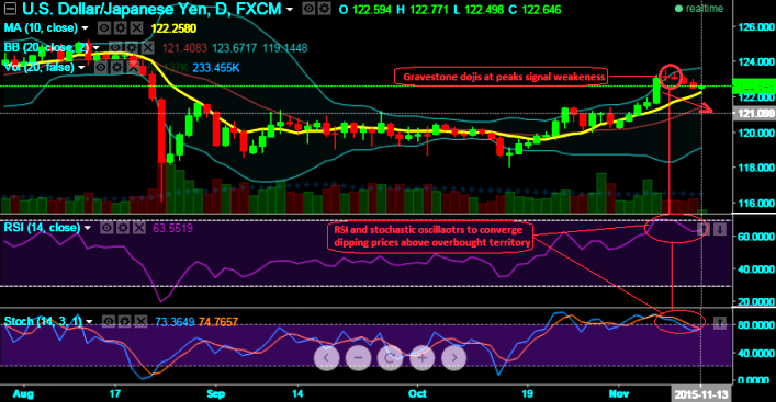 %D crossover over above 80 levels on stochastic curves indicates selling pressures. And in addition back to back Gravestone doji candles appeared at 123.164 and 123.122 to signify further weakness in this pair.