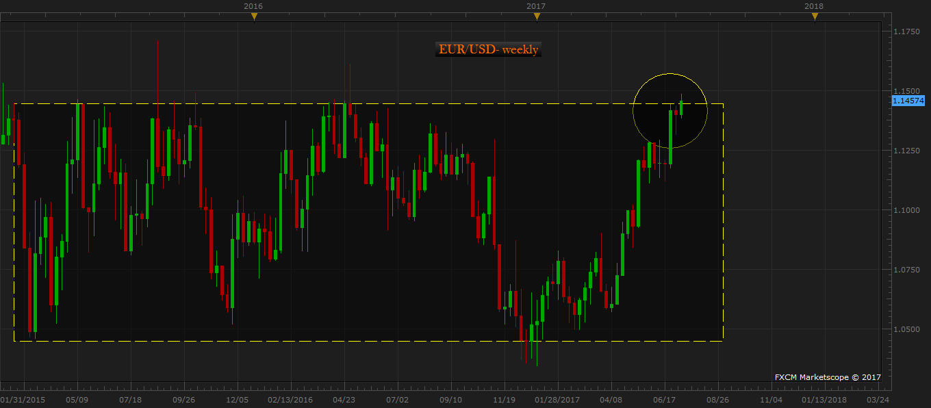 The hawkish commentaries from the European Central Bank (ECB) are pushing the single currency higher as the data continue to indicate a stronger economic recovery in the monetary Union. The euro is currently trading at 1.145 against the dollar, which is the highest level for the single currency since April 2016. While the initial bull side push came from the weakness of the dollar back in April this year, which got fuelled by French election win by Emmanuel Macron, the single currency is currently riding on the hawkish speculation with little influence from the dollar’s strength.