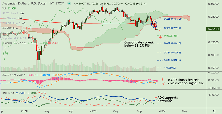 Technical bias for the pair is bearish. Price action has closed below 38.2% Fib. Scope for further downside.