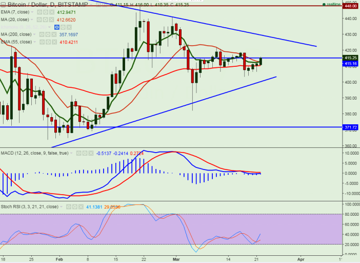 - BTC/USD has recovered after making a low of $403. It is currently trading around $415.