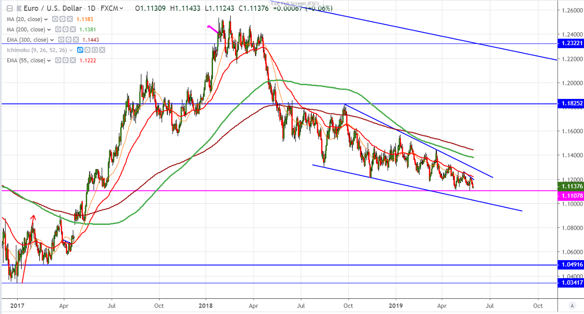 EURUSD trades lower for 3rd consecutive day and is marching towards 1.11069 low made on May 23rd 2019. The main reasons US dollar strength was