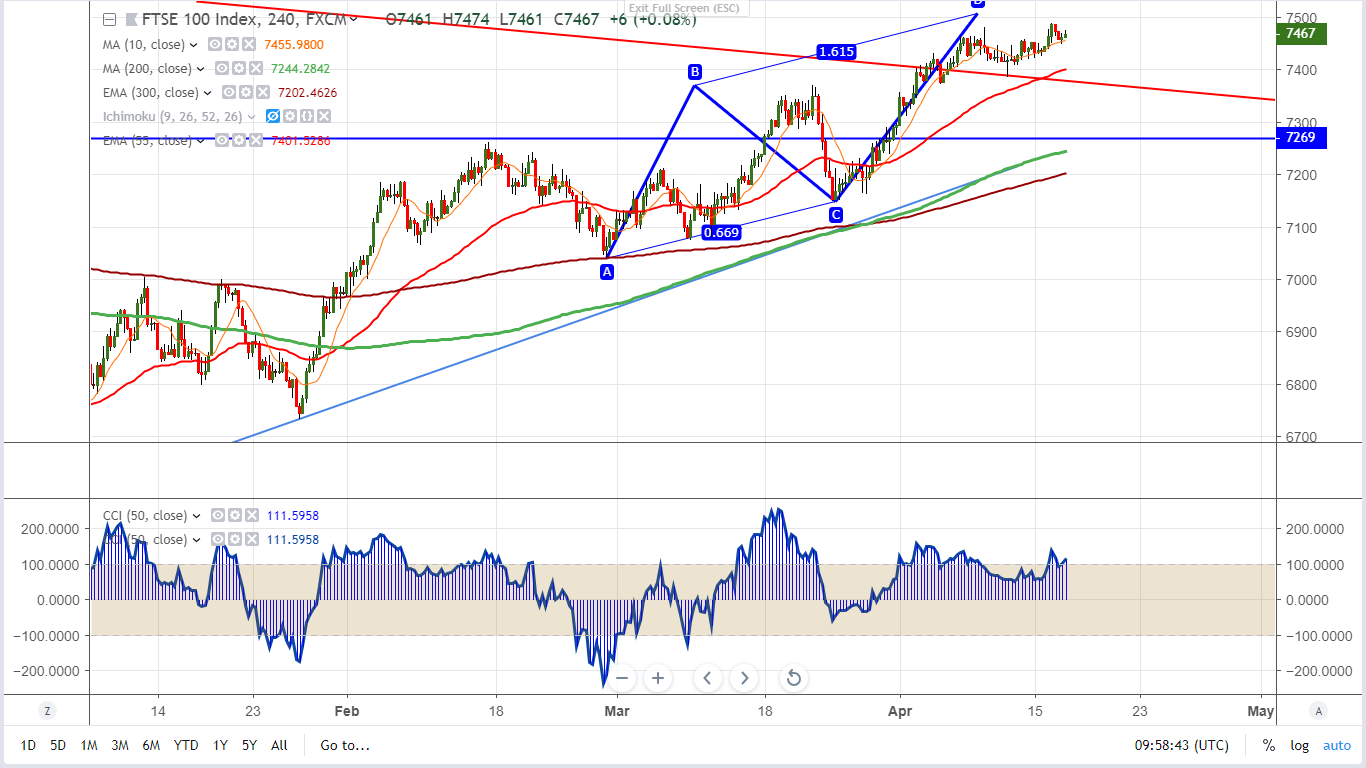 UK100 was trading higher for past 3 weeks and jumped more than 4.5% on account of US-China trade optimism which has increased risk appetite. It hits hits high of 7489 and is currently trading around 7471.UK CPI for Mar came at 1.9% in line with previous month but slightly below forecast of 2%.