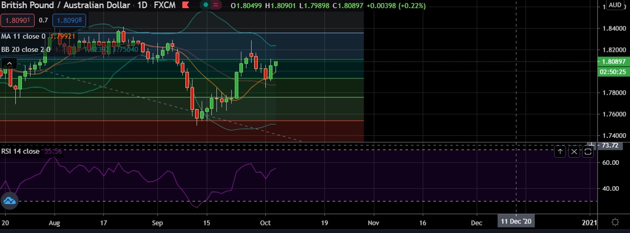 • At GMT 18:01, the pair was trading up 0.22 percent at 1.8088 after reaching daily low at 1.7989.