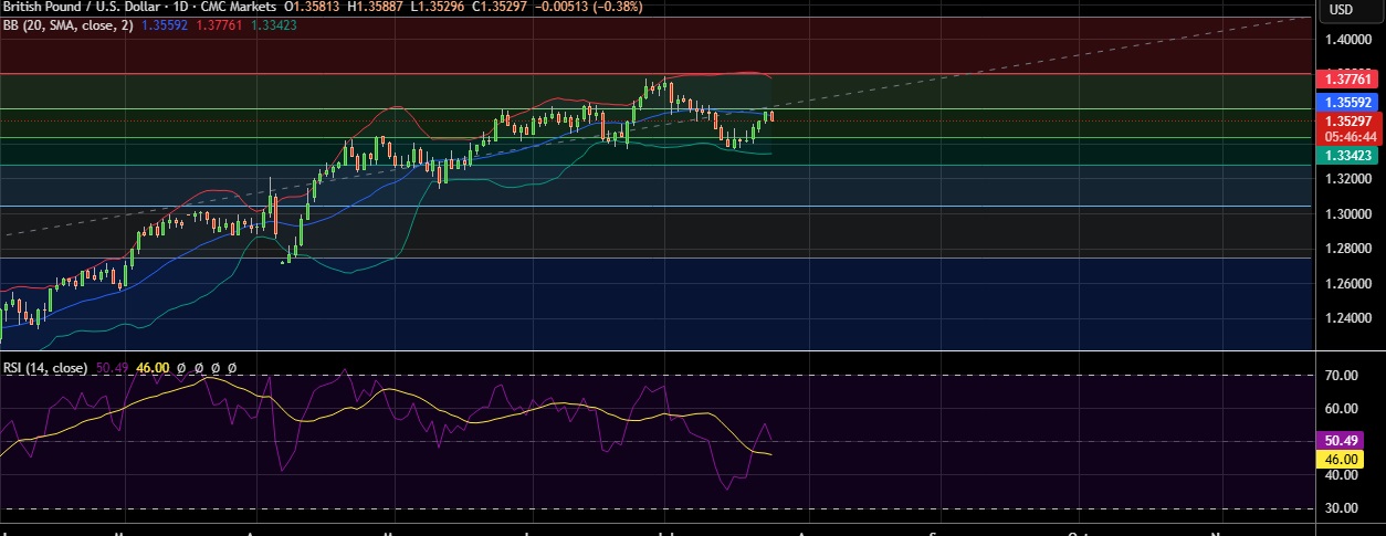 • Strong support is seen at 1.3437(50%fib) and break below could take the pair towards 1.3342(Lower BB).