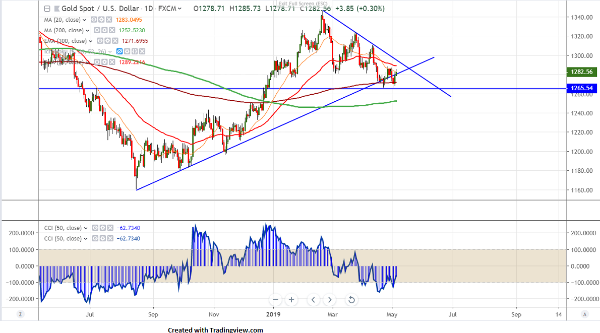 Gold has shown a massive recovery after hitting low of $1266.80 on Friday. US economy has added 263000 jobs in Apr compared to forecast of 181K and unemployment declined sharply from 3.8% to 3.6%. USD Index jumped till 98.10 but started to decline on slight weakness in average hourly earnings which came at 0.2% compared to estimate of 0.3%.It hits low of 97.41 and any break below 97.40 (20- day MA) confirms further weakness. The yellow metal hits high of $1285.73 and is currently trading around $1282.35.