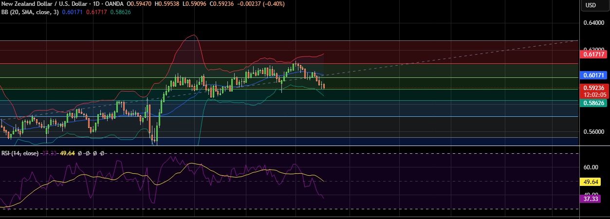 • Support is seen at 0.5912(50%fib)and break below could take the pair towards 0.5869(Lower BB).