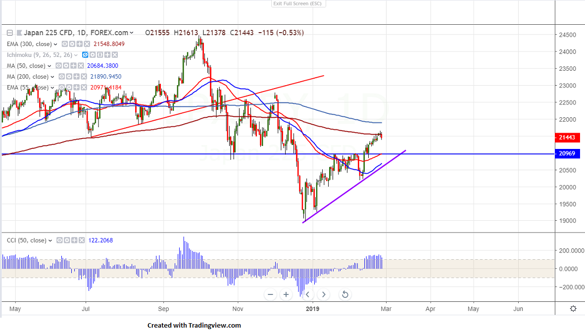 The near term resistance is at 21550 (300- day EMA) and any break above targets 21700/21918.
