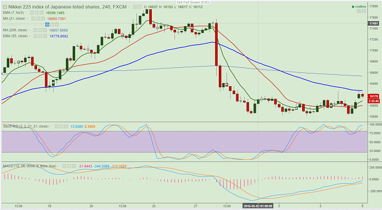 - Nikkei index slightly recovered after making a low of of 15835.It is currently trading around 16167.
