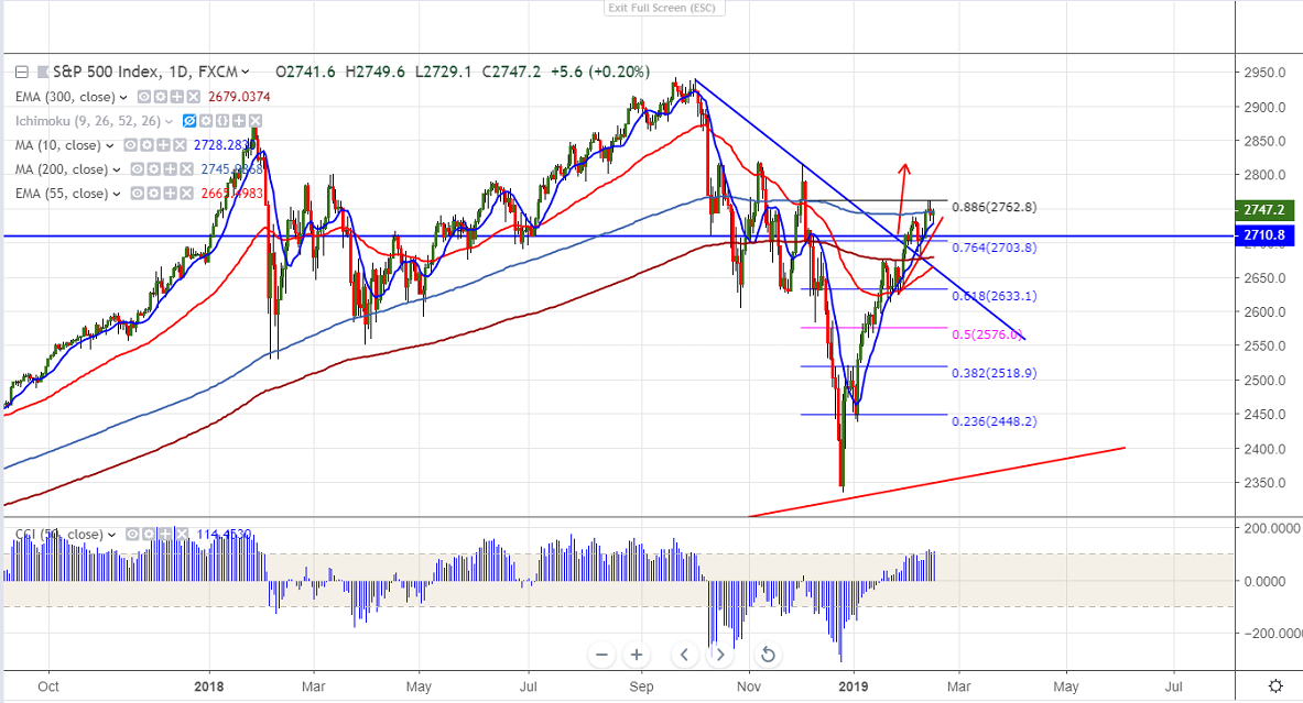 S&P500 has halted its 4 days of winning streak and declined nearly 30 points from high of 2763 on US-China trade pessimism and weak US retail sales data.US retail sales has declined 1.2% in Dec biggest drop since Sep 2009. The index has taken support near 5 day MA and shown a minor jump. It hits intraday high of 2763 and is currently trading around 2747.