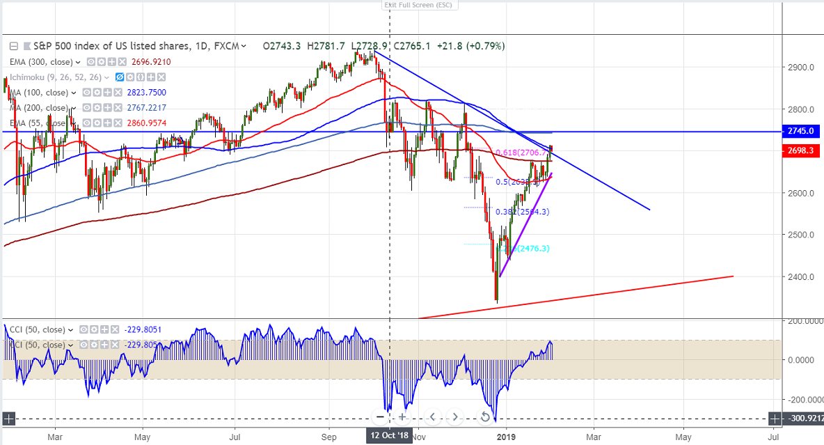 S&P500 has jumped 7.9% in the month of Jan best month since 1989. The index jump was mainly due to better corporate earnings and dovish Fed.US Fed was more dovish and pledges ‘patience’ stance for further moves . Out of 210 S&P500 companies that has reported results in that 79 posted better than expected earnings.The index hits high of 2713 and is currently trading around 2699.