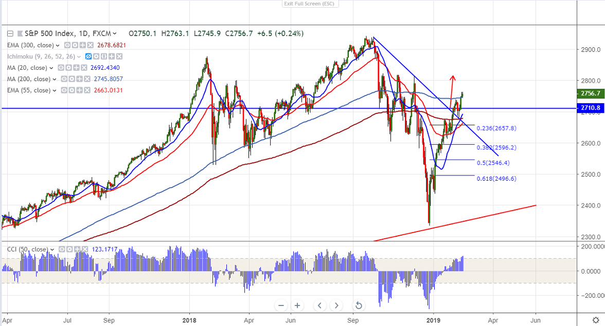 S&P500 is trading higher for fourth consecutive day after breaking major resistance around 2744. The index has closed above 200- day MA for 2nd consecutive day on US-China trade optimism and better than expected corporate earnings. The index hits intraday high of 2763 and is currently trading around 2757.