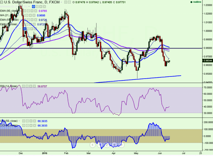 - USD/CHF should close above 0.9780 (90 day EMA) for trend reversal.