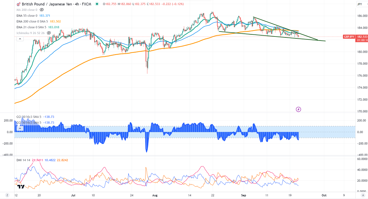 GBPJPY lost its shine on the weak Pound sterling. It hit a low of 182.38 at the time of writing and is currently trading around 182.665.