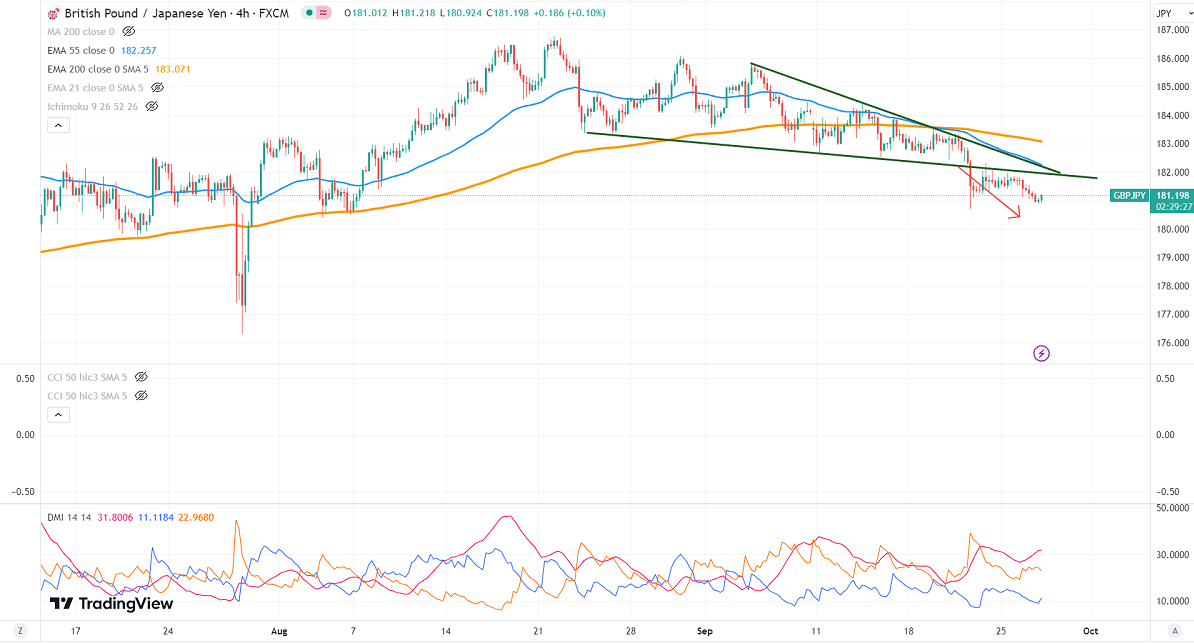 GBPJPY declined sharply on weak Pound sterling. It hit a low of 180.71 yesterday and is currently trading at around 181.19.