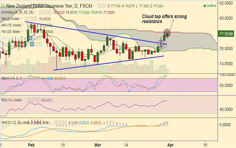 - Cloud top at 78.16 is strong resistance for the pair. Further upside can be seen on breaks above.