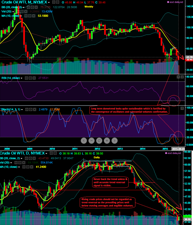 While %D crossover sustains below 20 levels on slow stochastic (currently %D line at 12.2688 & %K line at 2.4879), so overall we don't see any sort of strength in this commodity that can pull back from current levels. Prevailing prices are well below moving averages both on daily and monthly charts as well. Hence, we conclude this week's opinion on crude as still a weaker commodity.