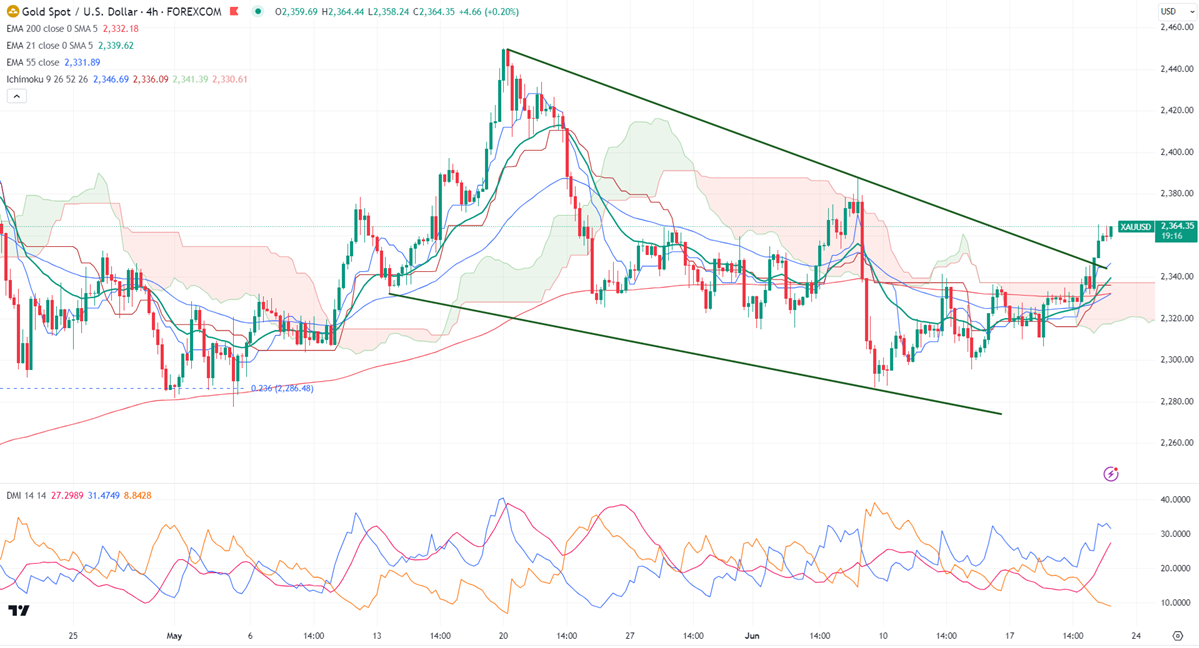 Gold showed a minor pullback after dismal US economic data. It hit a high of $2365 yesterday and is currently trading around $2362.