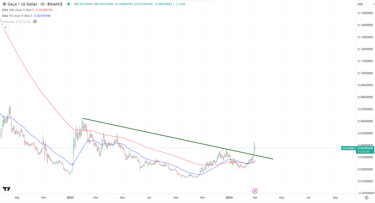 GALAUSD hits 10 months due to the introduction of GalaSwap on th gaming company networks. It surged more than 100% this month and holds above the short-term (21 and 55 EMA) and above the long-term moving average. It hit a high of $0.04327 and is currently trading around $0.03820.