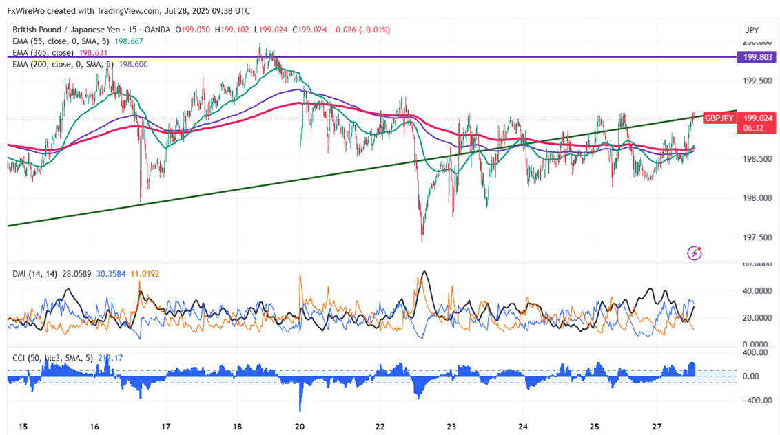 The GBP/JPY pair is trading above 55 and above 200 EMA (Short-term) and 365 EMA (long-term) on the 15-min chart, confirming a mixed trend. Any violation below 198.40 indicates the intraday trend is weak. A dip to 198/197.70/197.40/196.70/196.25/195.25/194/193.70 is possible. Immediate resistance is at 199.20, a breach above this level targets 200/202/204.