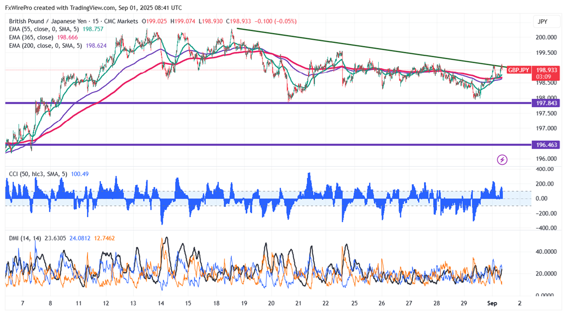 The pair is trading above the 55 and 200 EMA, as well as the 365 EMA (long-term), on the 1-hour chart, confirming a bullish trend. Any violation below 198.50 indicates the intraday trend is weak. A dip to 197.85/197.25/ 196.70/196.20/195 is possible. Immediate resistance is at 199.30; a breach above this level targets 199.55/200/200.28/202.
