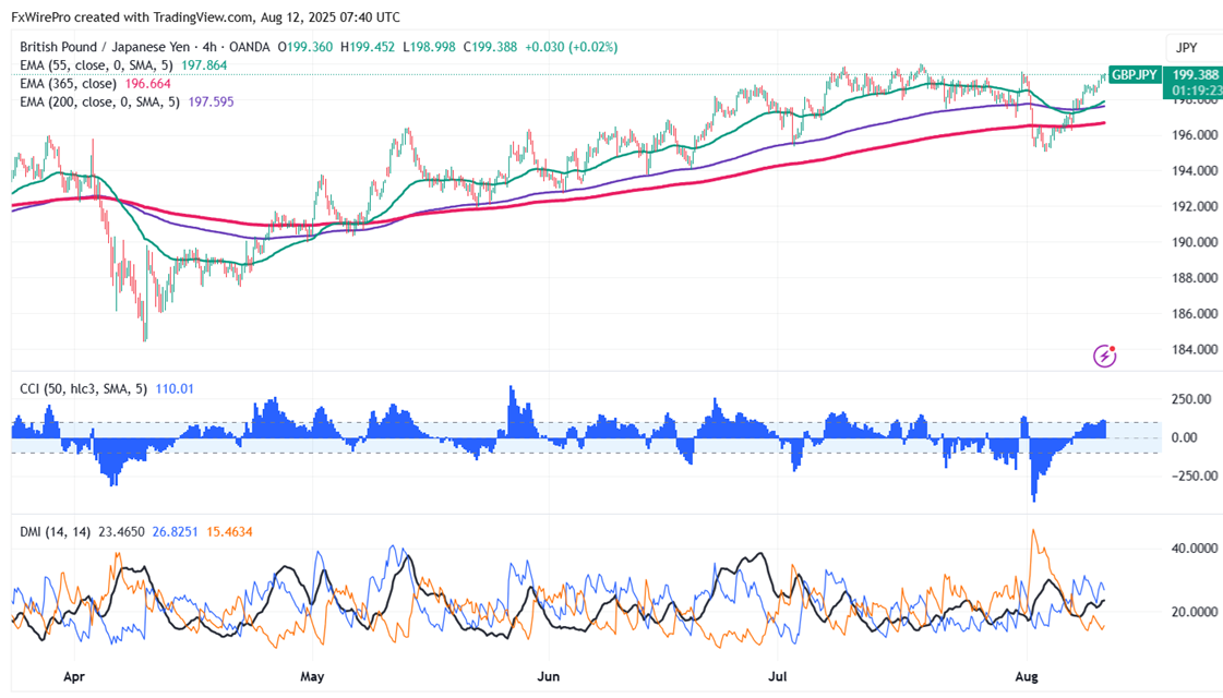 ‘The GBP/JPY pair is trading above 55 and 200 EMA (Short-term) and 365 EMA (long-term) on the 4-hour chart, confirming a bullish trend. Any violation below 198.55 indicates the intraday trend is weak. A dip to 197.75/196.70/196.20/195/194/193/191.95/190 is possible. Immediate resistance is at 199.60, a breach above this level targets of 200/202.