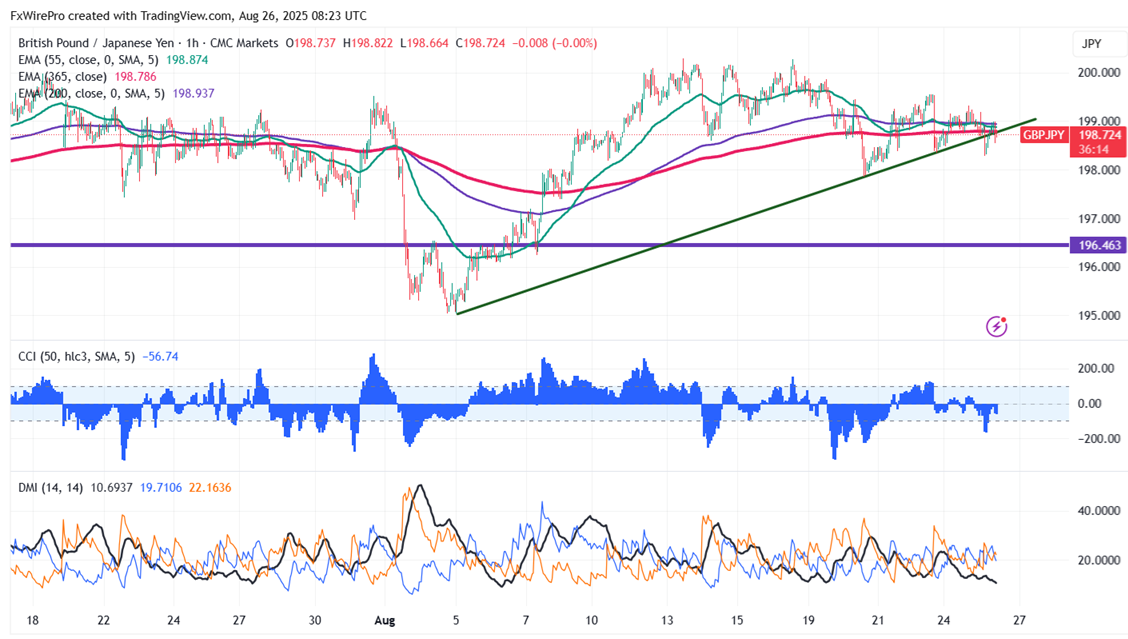 The pair is trading above 55 and 200 EMA and 365 EMA (long-term) on the 1-hour chart, confirming a bullish trend. Any violation below 198.40 indicates the intraday trend is weak. A dip to 197.85/197.25/ 196.70/196.20/195 is possible. Immediate resistance is at 199.45 a breach above this level targets of 200/200.28/202.